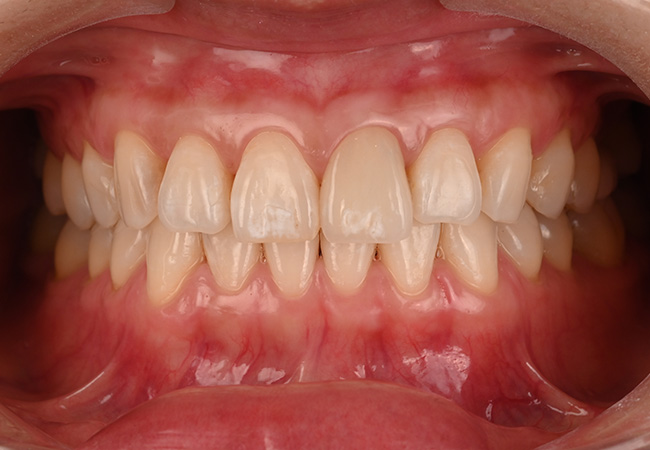 中等度歯周炎、受動的萌出不全(Altered passive eruption)、上顎前歯部正中離開および関連する審美障害