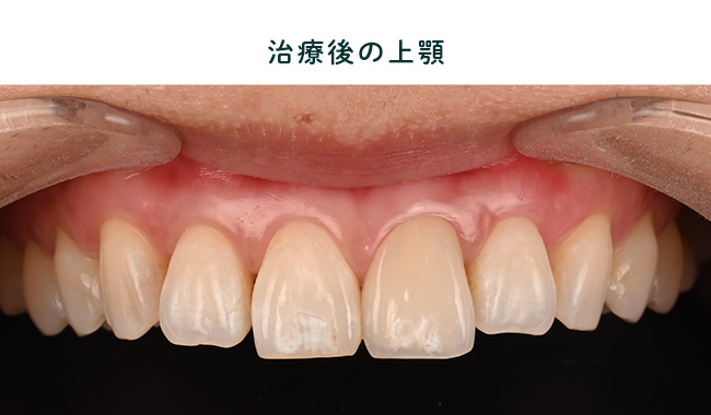 左上1ジルコニアレイヤリングクラウン装着、上顎左右2根面被覆、ガムブリーチ