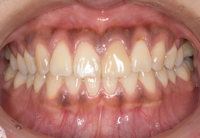 左上1不良補綴物、上顎左右2根面露出、上下顎歯肉着色